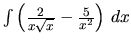 1. $\int(3x^2 + 2x - 1)\,dx$. 		 2. $\int \left( \frac{2}{x\sqrt{x}} - \frac{5}{x^2} \right)\,dx$.