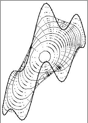 The sequence of evolving spirals for beta(k,ni)= k^{1/3} using redistribution. The limiting curve is an ellipse rounded point.